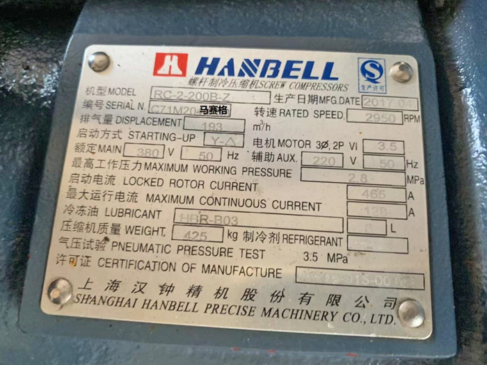 二手RC-2-200B-W漢鐘壓縮機,九成新。功率:45Kw.排氣量:193m3/h.